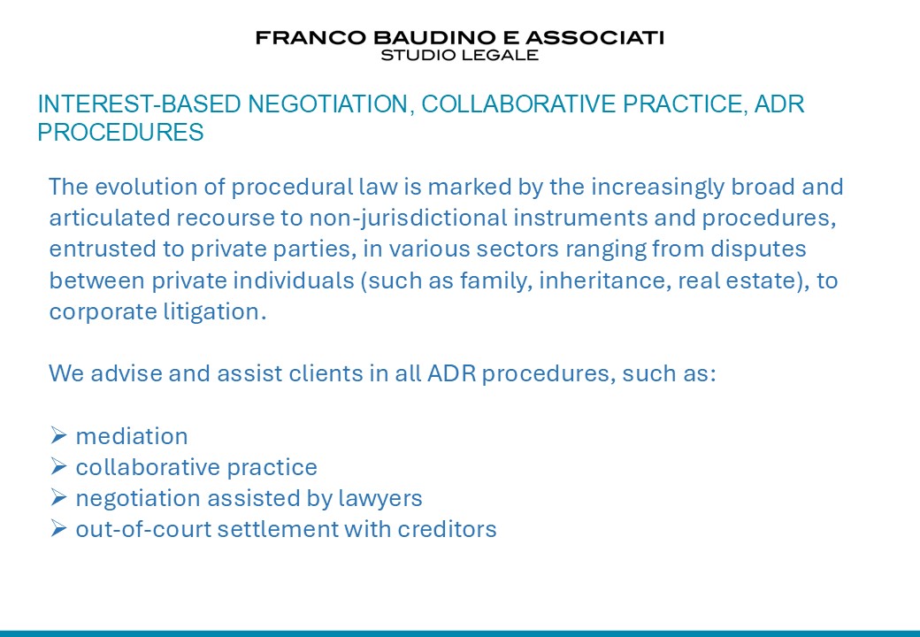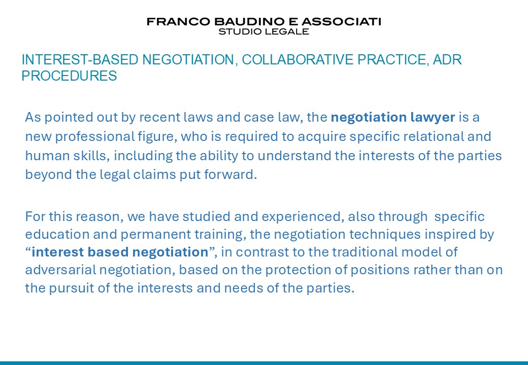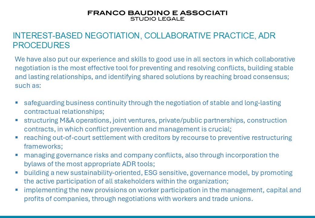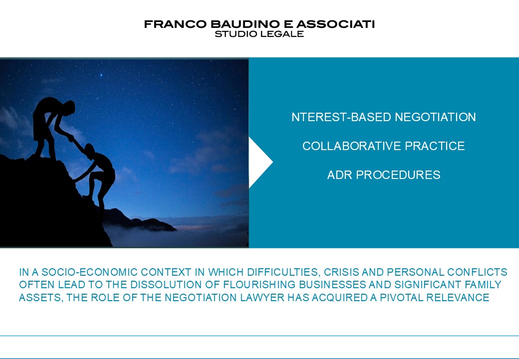 Our team provides assistance to both private clients and businesses in all the situations in which negotiation is the key to preventing and resolving conflicts, managing risks, building stable and lasting relationships, and achieving a collaborative governance environment necessary to pursue a sustainable progress.